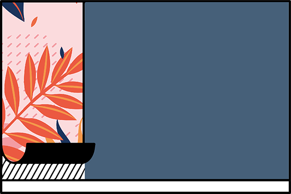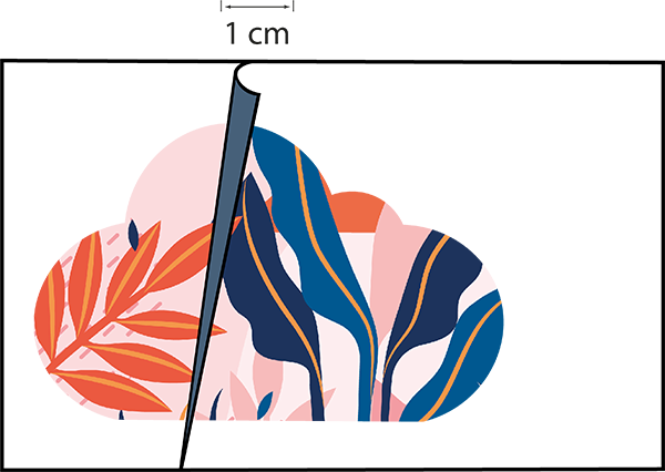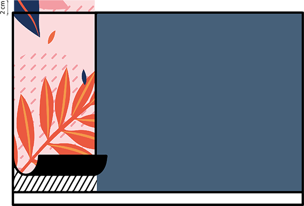 Não é necessário sobreposição, aplique os papéis lado a lado e certifique-se de que as artes estejam alinhadas. Utilize uma espátula para evitar bolhas de ar e um pano para fixar o restante do papel e retirar o excesso de cola caso vaze para fora.