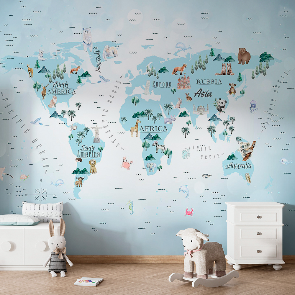 Papel de Parede Infantil de Mapa Mundi Azul Bebe com Animais