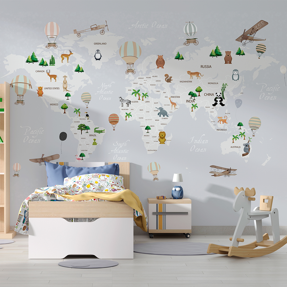 Papel de Parede Infantil de Mapa Mundi Cinza Claro com Bege e Diversos Animais e Aviões