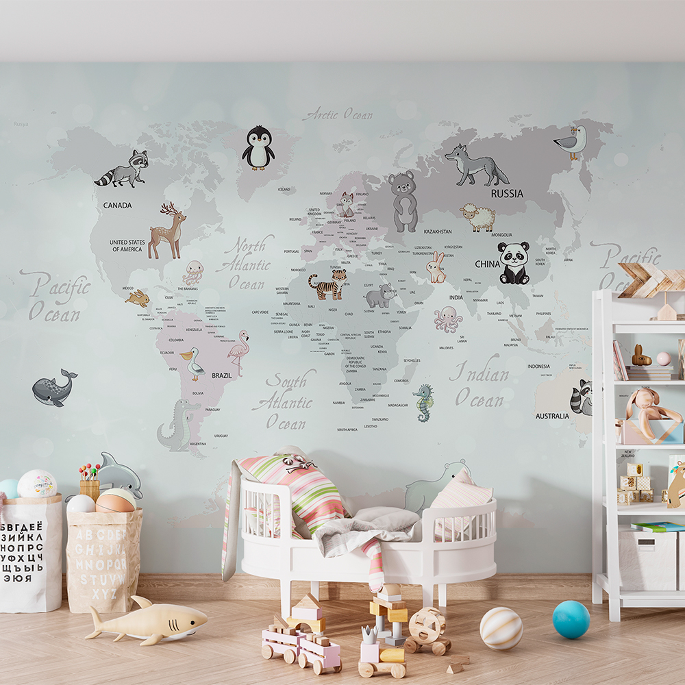Papel de Parede Infantil de Mapa Mundi Cinza com Animais Fofos