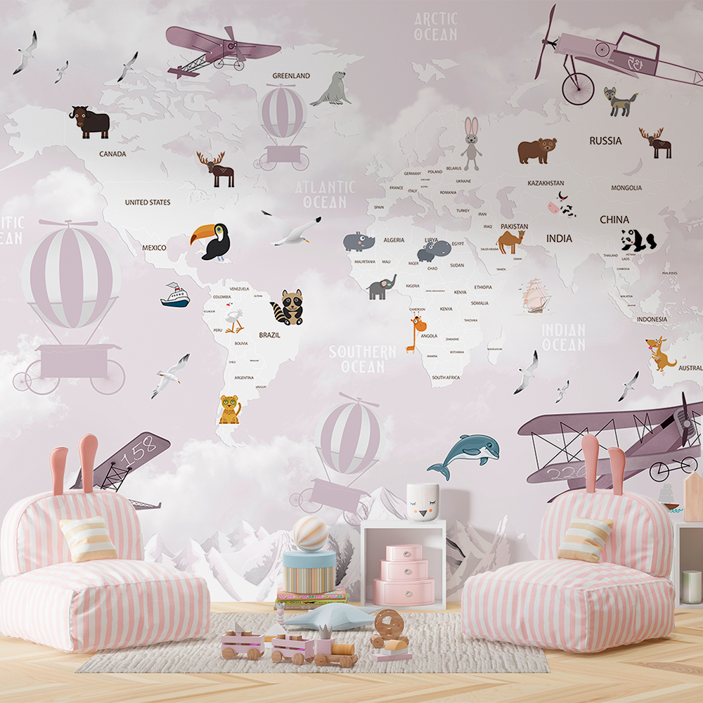Papel de Parede Infantil de Mapa Mundi com Aviões e Balões em tons de Rosa