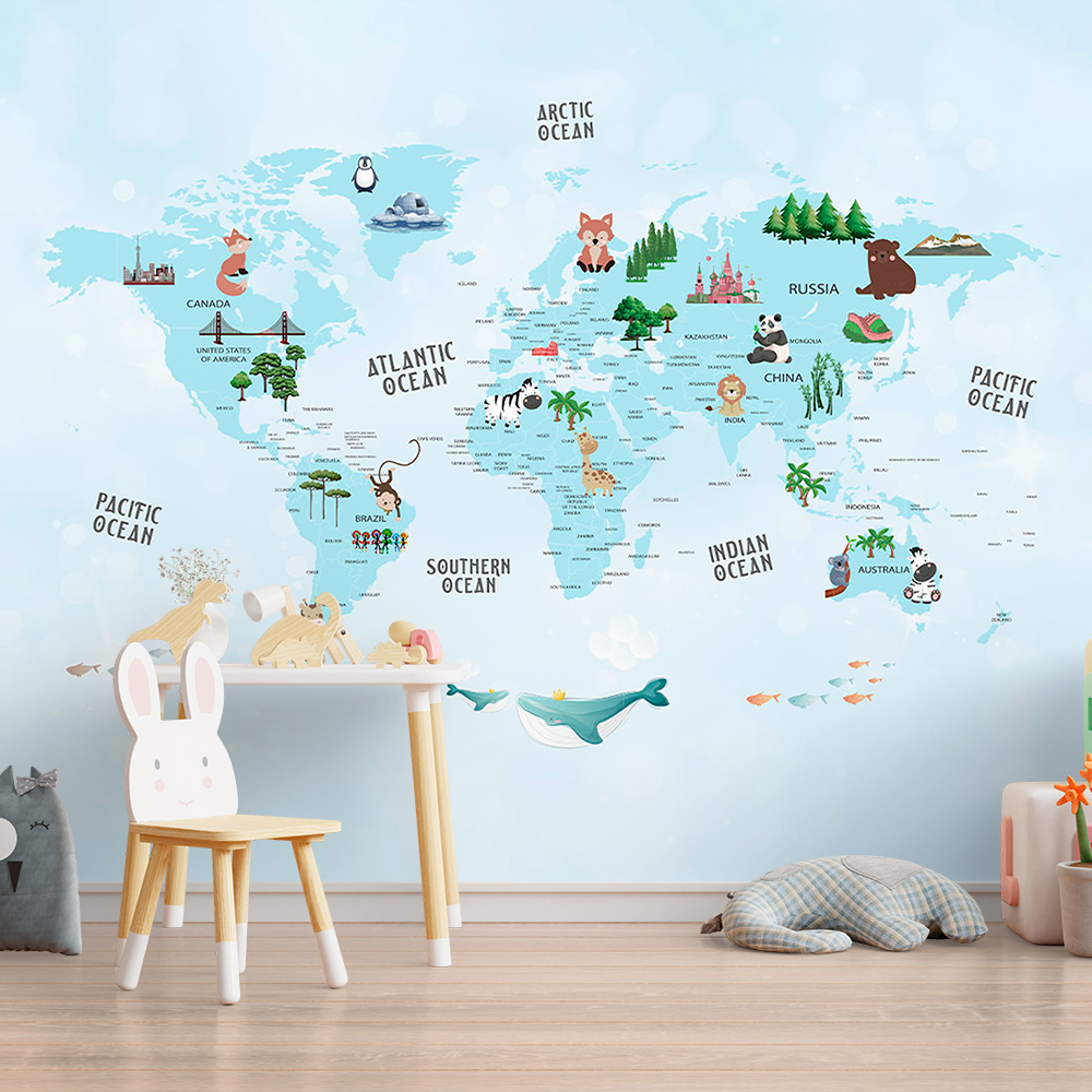Papel de Parede Infantil de Mapa Mundi em Tons de Azul com Diversos Animais Coloridos