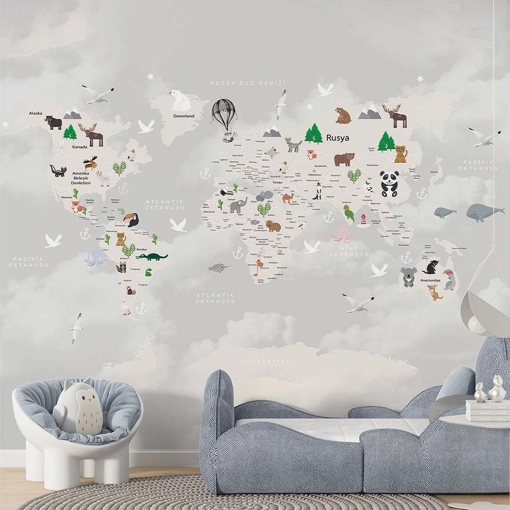 Papel de Parede Infantil de Mapa Mundi em tons de Cinza com Diversos Animais e Nomes