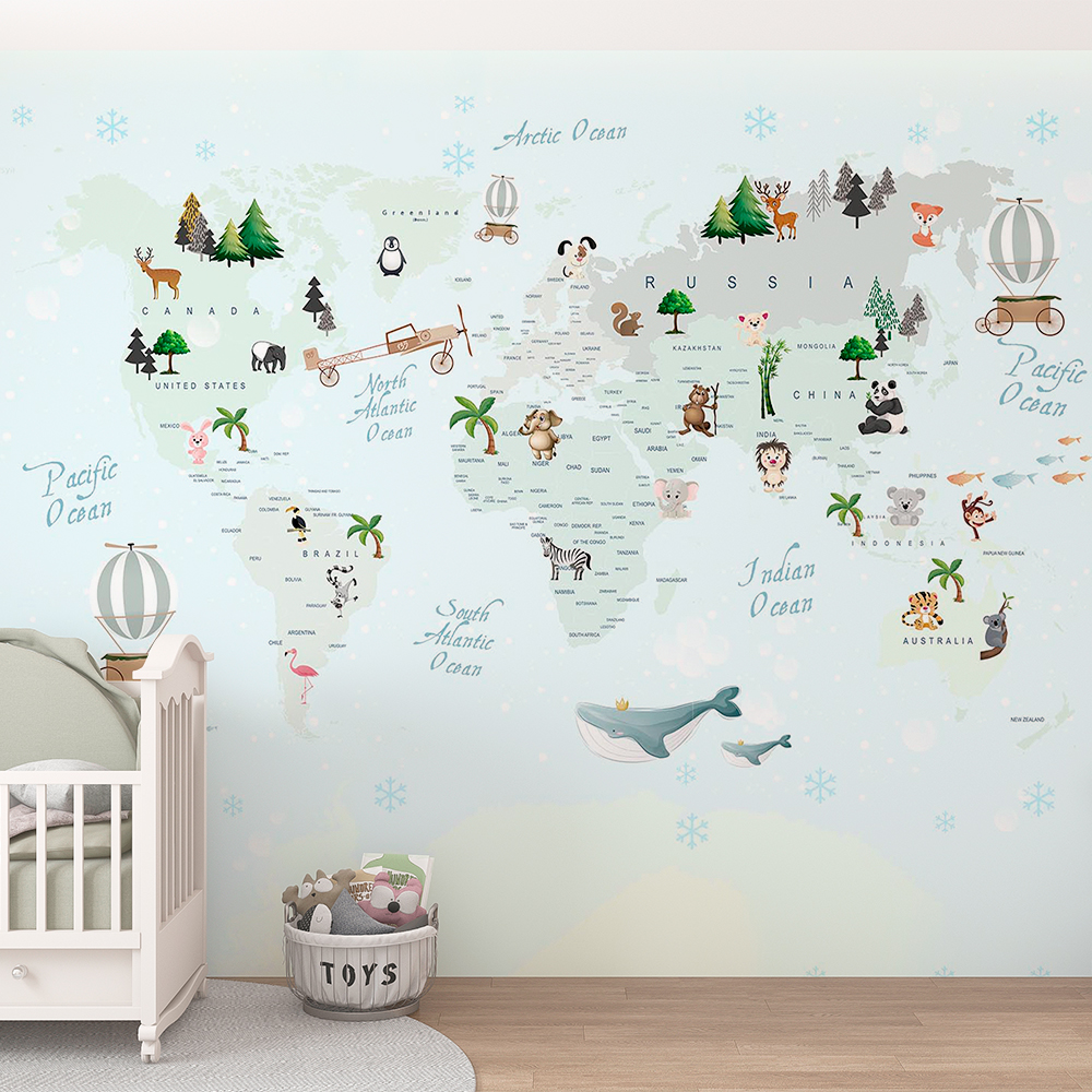 Papel de Parede Infantil de Mapa Mundi em tons de Pastel com Balões e Animais