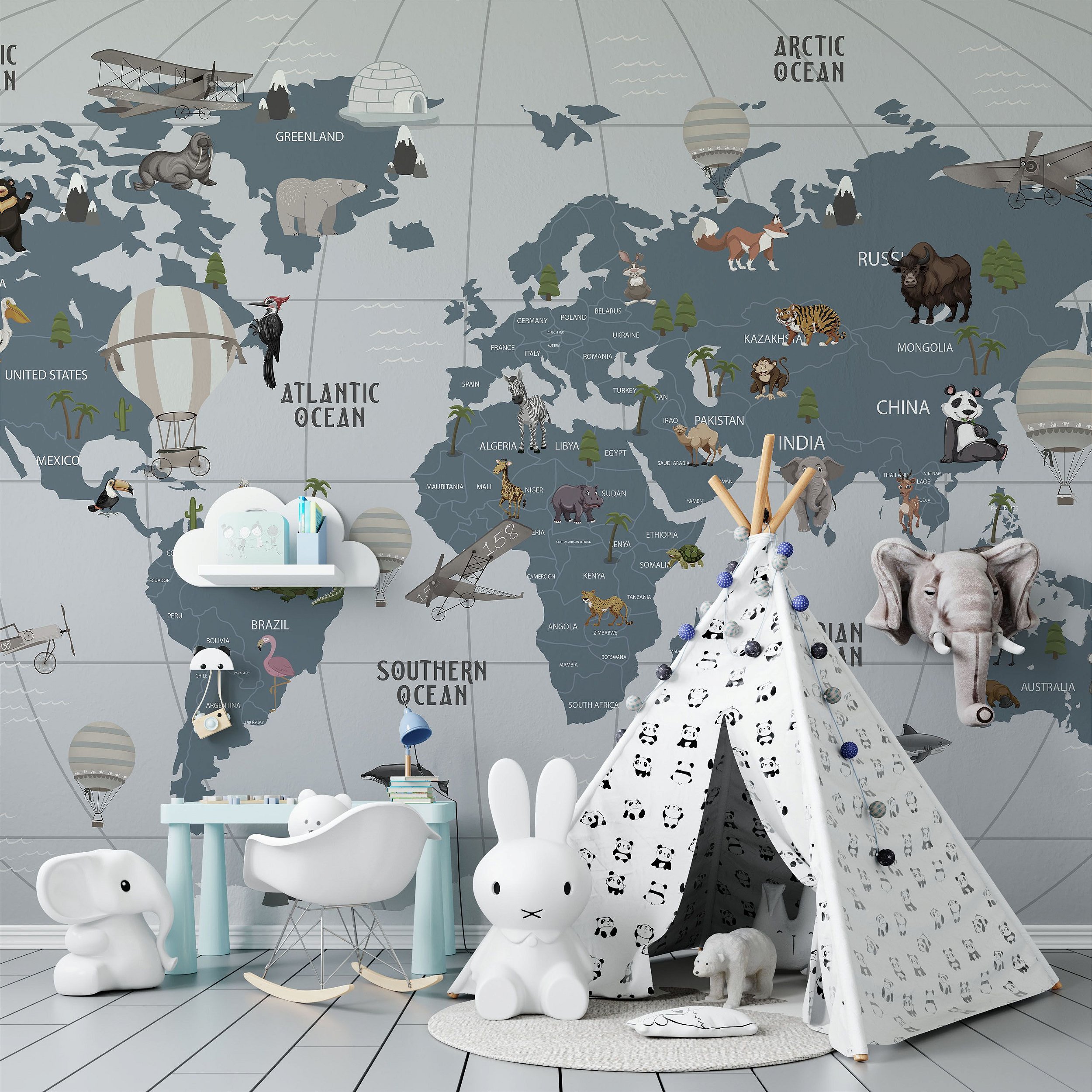 Papel de Parede Infantil de Mapa Mundi Mapa Mundi em Tons de Azul com Balões de Ar Quente