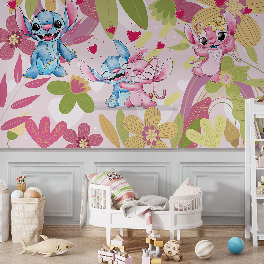 Papel de Parede Infantil Stitch e Angel no Jardim da Primavera
