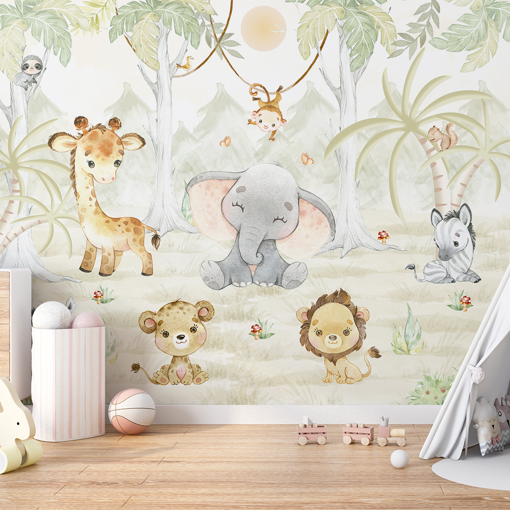 Transforme o quarto em uma aventura encantadora com o nosso papel de parede Safari Aquarelado!