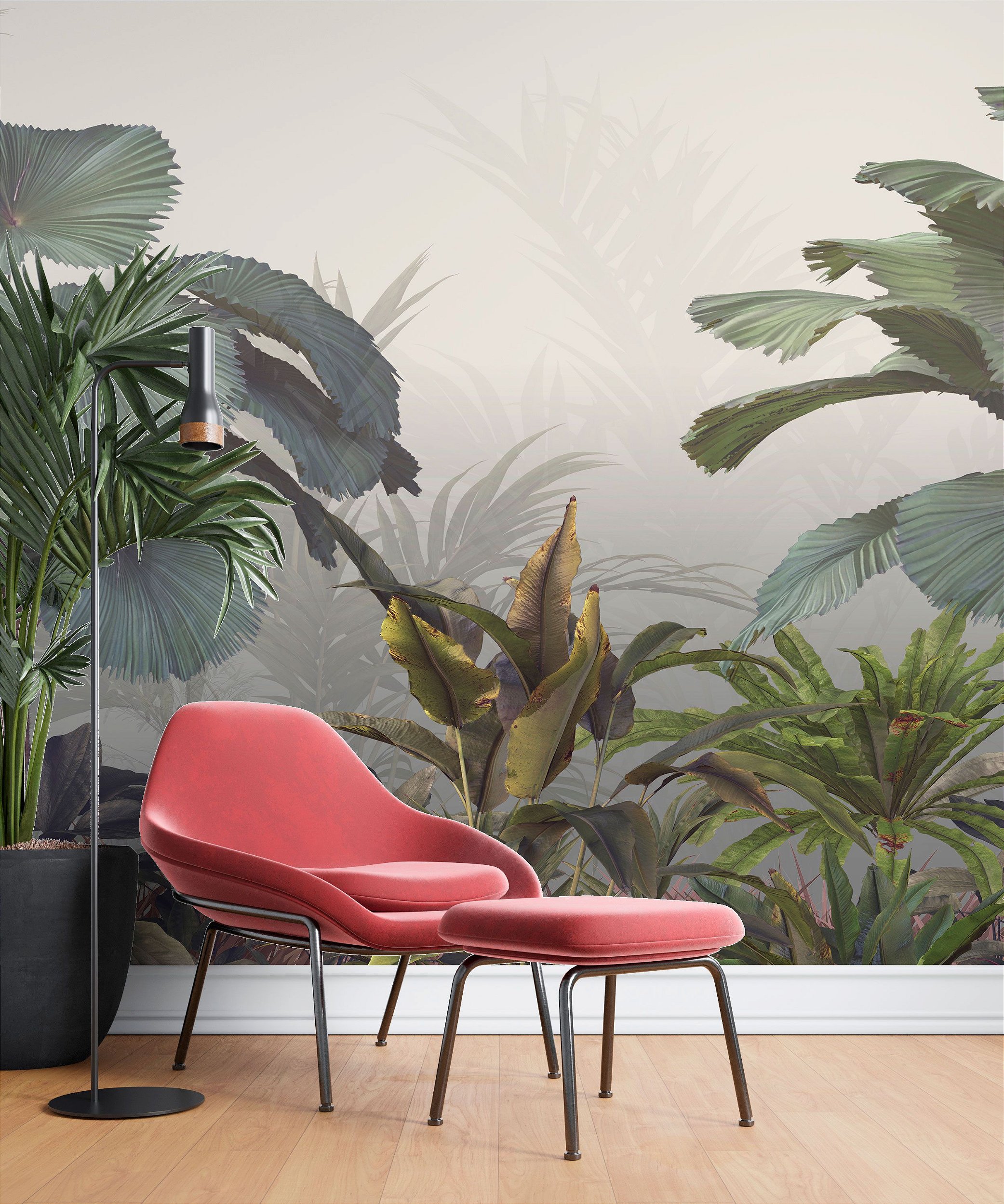 Papel de Parede Safari com Folhas Grandes e Neblina 1