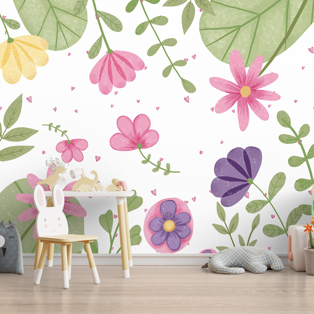 Papel de Parede infantil flores e folhas em aquarela rosa amarelo e verde